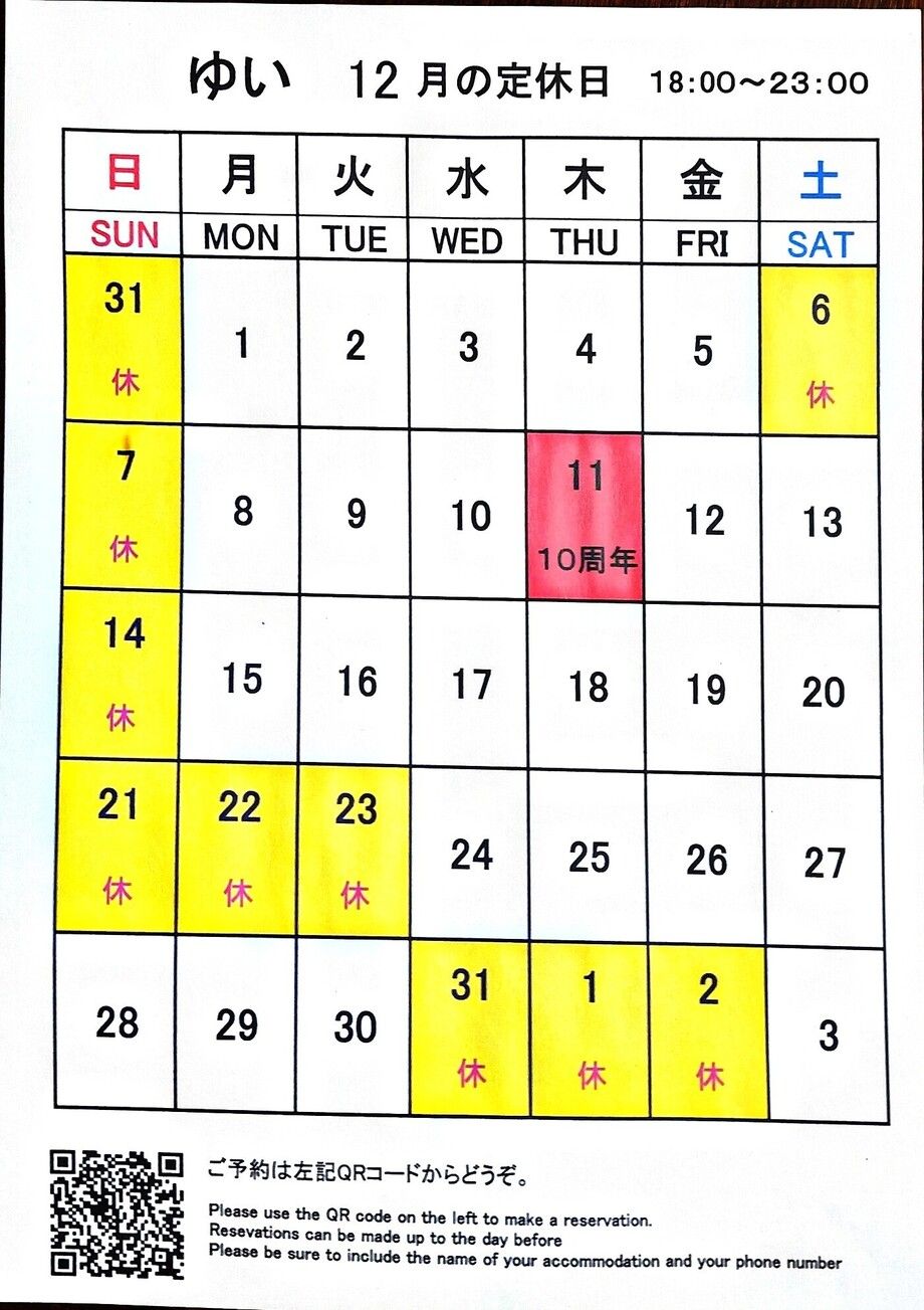12月の定休日&年末年始の定休日です。