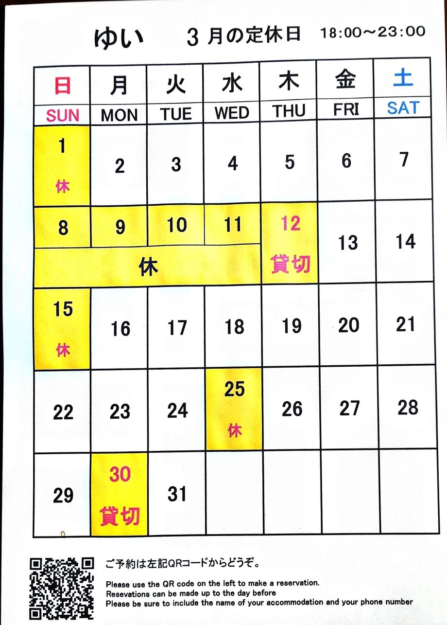 3月の定休日です。